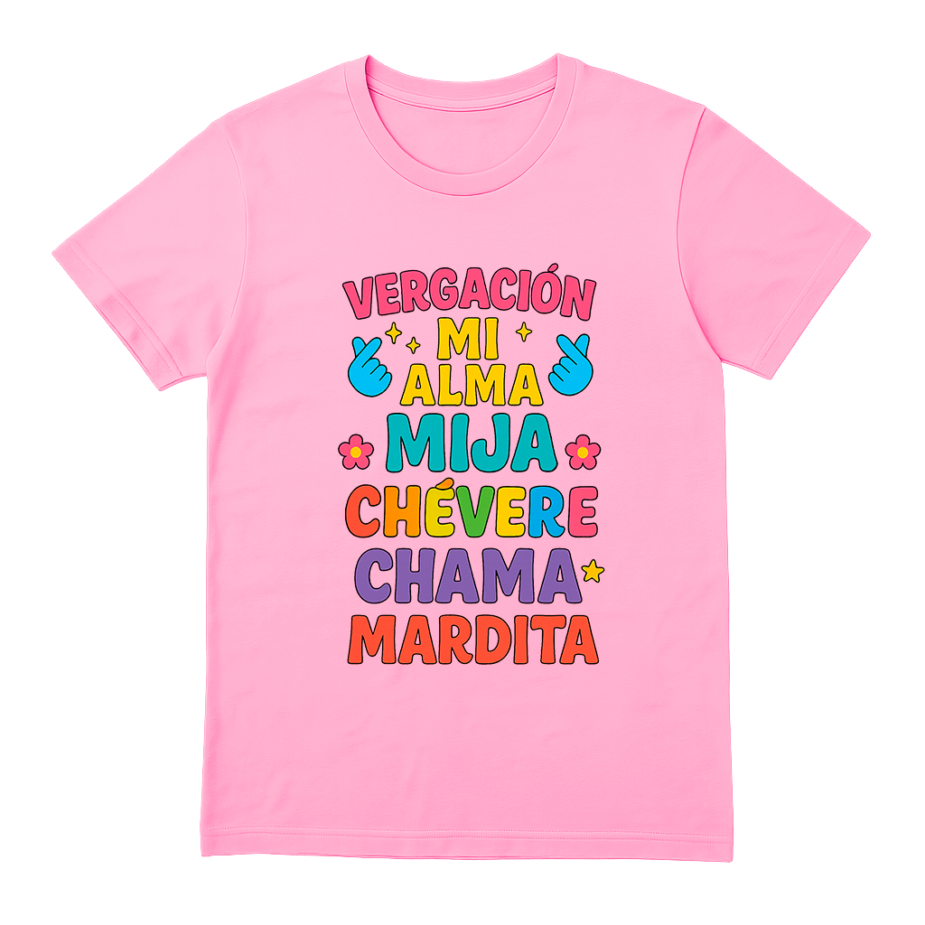 Franela divertida y colorida con expresiones maracuchas como Vergación, Mi Alma, Mija, Chévere, Chama, Mardita. Perfecta para destacar tu estilo único, regalar o lucir con orgullo tus raíces venezolanas.